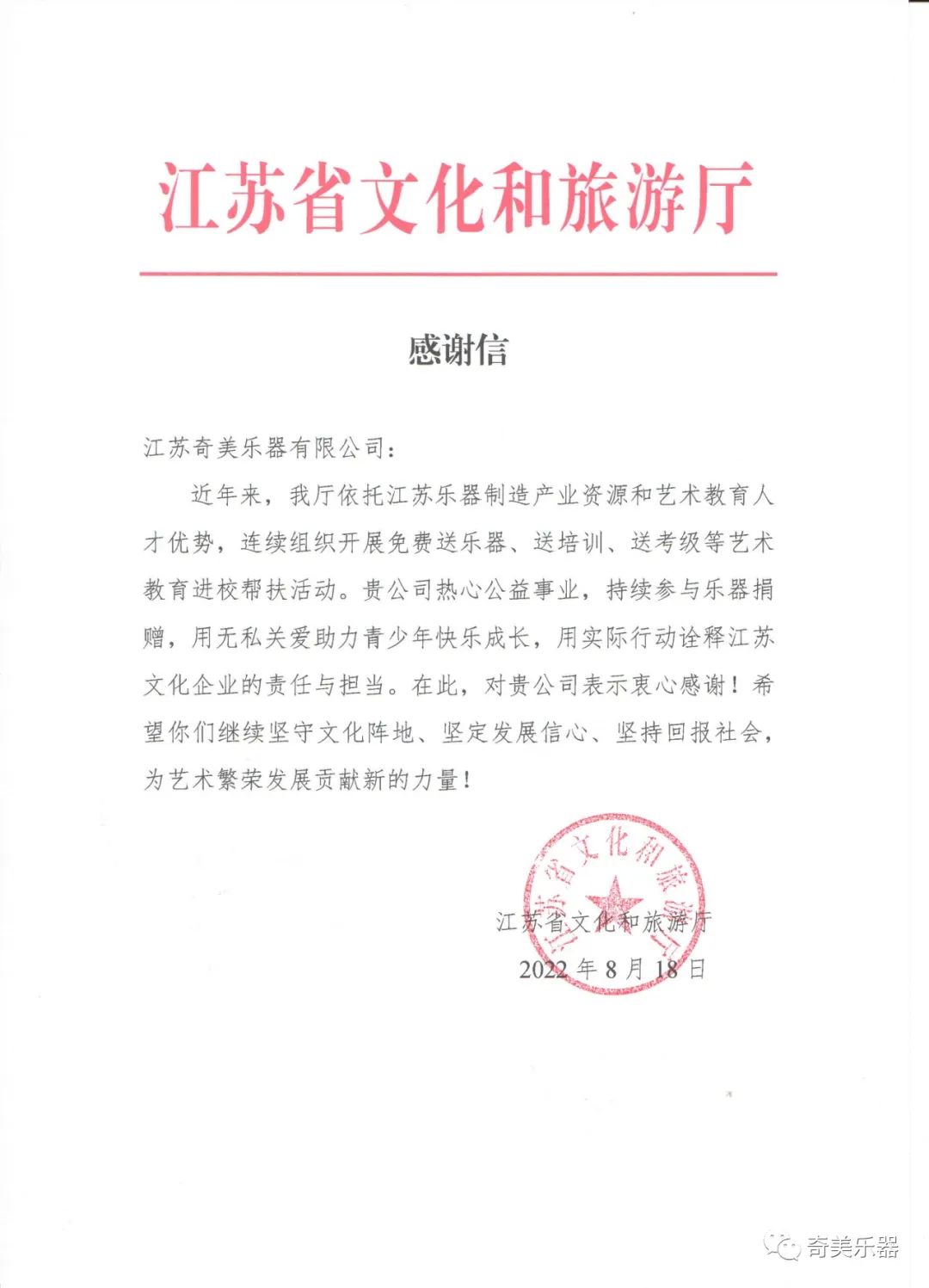 近日,奇美公司收到了來自江蘇省文化和旅游廳的感謝信,感謝奇美公司長(zhǎng)期以來對(duì)藝術(shù)教育扶貧工作的關(guān)心和支持。